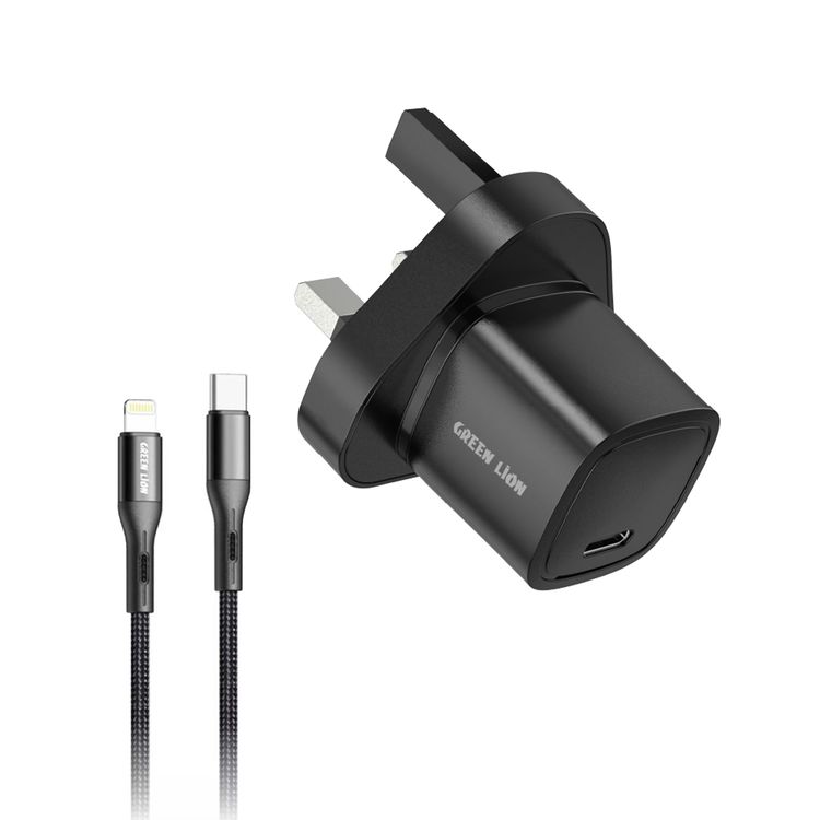 Green Lion Mini UK Charger with Type-C to Lightning Cable, 20W Power Delivery, 100-240V Input Voltage, Multiple Protections, Fast Charging Support, Compact & Lightweight Design - Black