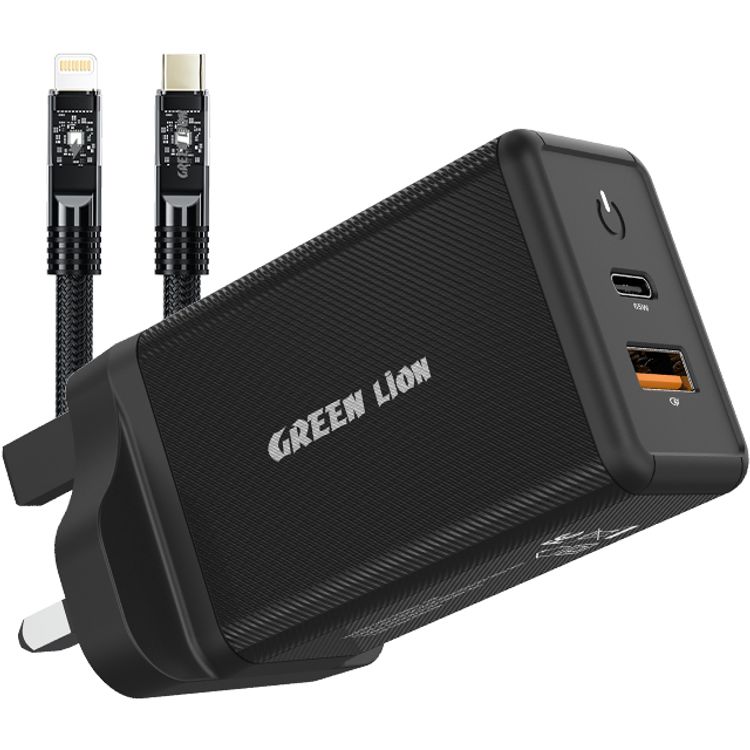 Green Lion 65W GaN Wall Charger with USB-C to Lightning Cable, 65W Power Delivery, UK 3-Pin Plug, Wide Compatibility, 27W Cable Current, Multi Protection - Black