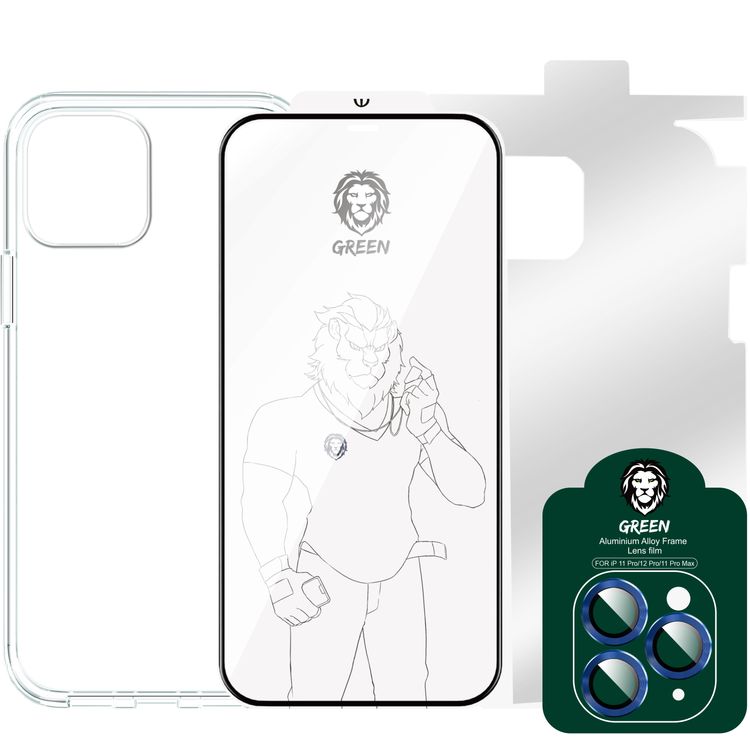 Green Lion 4 in 1 360° Protection Pack, Camera Lens Film + Shockproof Drop Case + Nano HD Protector + 3D Armor Edge Glass, for iPhone 12 / 12 Pro ( 6.1" ) Blue