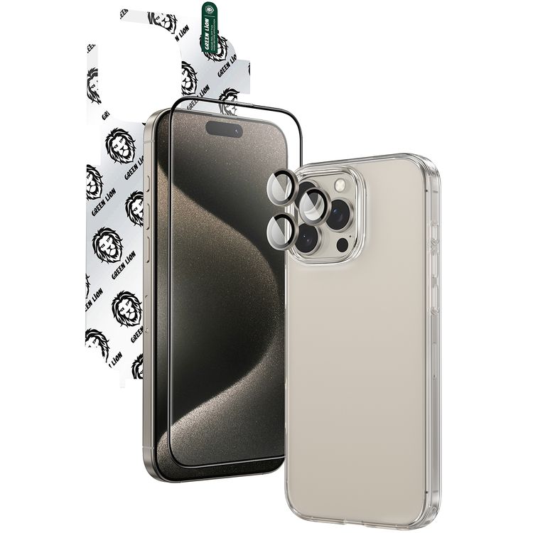 Green Lion 4-in-1 Defender Pack for iPhone 16 Pro, Anti-Shock Case, Nano HD Full Protection, Camera Lens Film, 3D Pet HD Glass - Titanium
