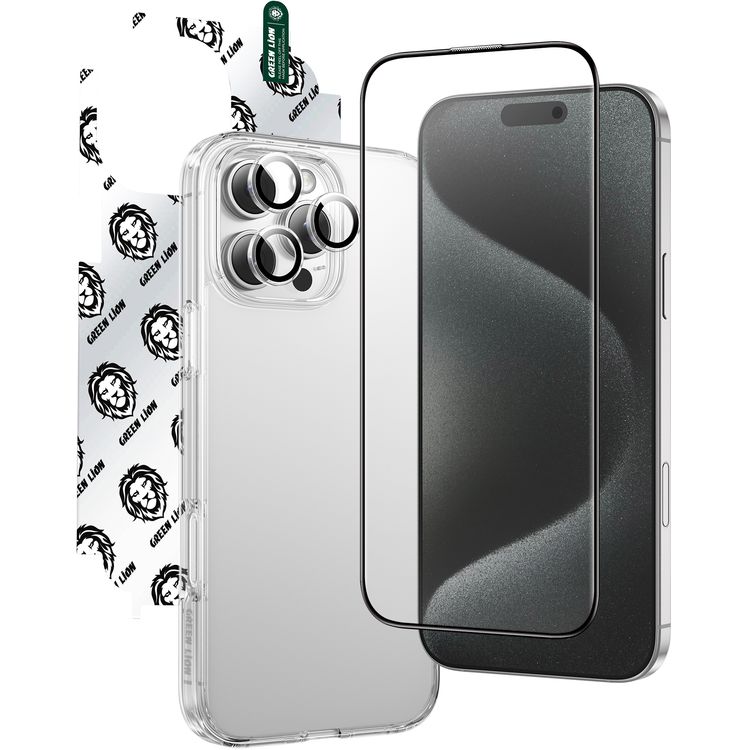 Green Lion 4-in-1 Defender Pack for iPhone 16 Pro Max, Anti-Shock Case, Nano HD Full Protection, Camera Lens Film, 3D Pet HD Glass - Clear