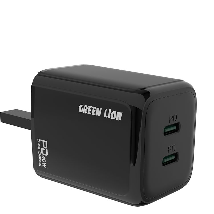 Green Lion Dual PD Wall Charger with 40W Power Up Safely, UK Power Plug, 2 Ports Type-C Output, Fast Charging, Ultra Portable, Charging Protection - Black