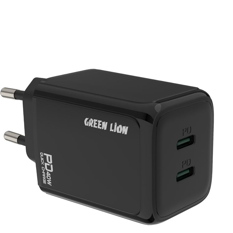 Green Lion Dual PD Wall Charger with 40W Power up Safely, EU Power Plug, 2 Ports Type-C Output, Fast Charging, Ultra Portable, Charging Protection - Black