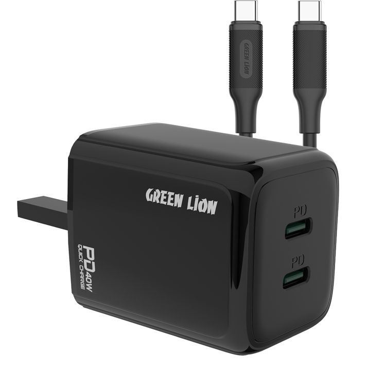 Green Lion Dual PD Wall Charger with USB-C to USB-C Cable, 40W Power up Safely, UK Power Plug, 2 Ports Type-C Output, Fast Charging, Ultra Portable, Charging Protection - Black