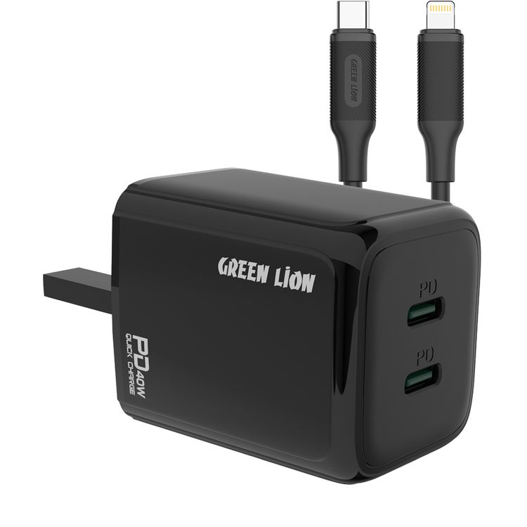 Green Lion Dual PD Wall Charger with USB-C to Lightning Cable, 40W Power up Safely, UK Power Plug, 2 Ports Type-C Output, Fast Charging, Ultra Portable, Charging Protection - Black