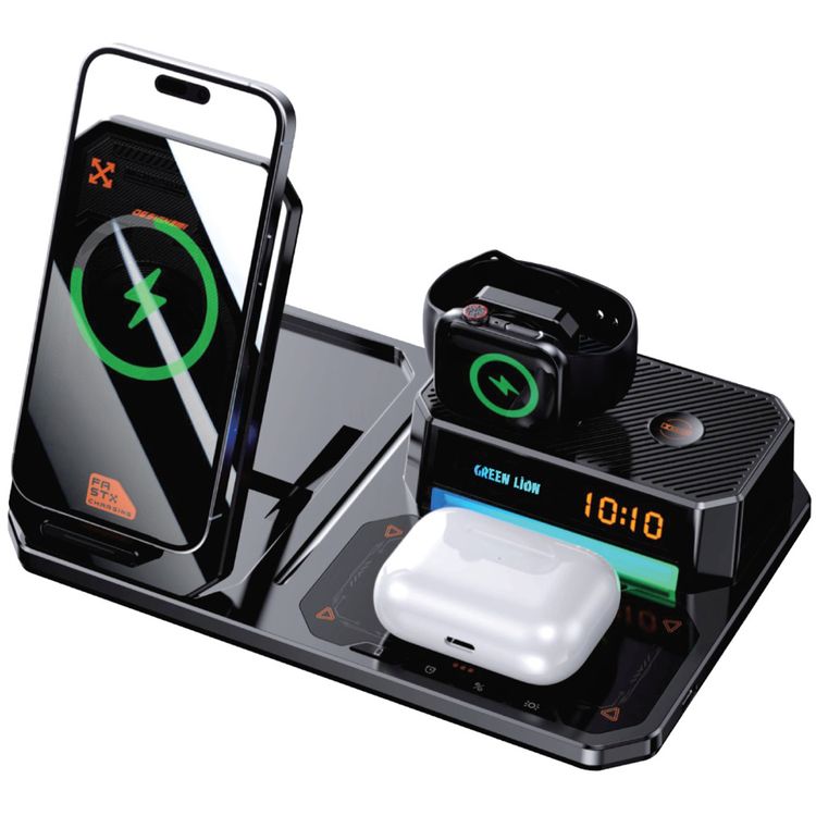 Green Lion 6-in-1 Multifunctional Wireless Charger with Bluetooth Speaker, 15W Maximum Wireless Power Output, One Touch Auto Lift, Digital Clock - Black