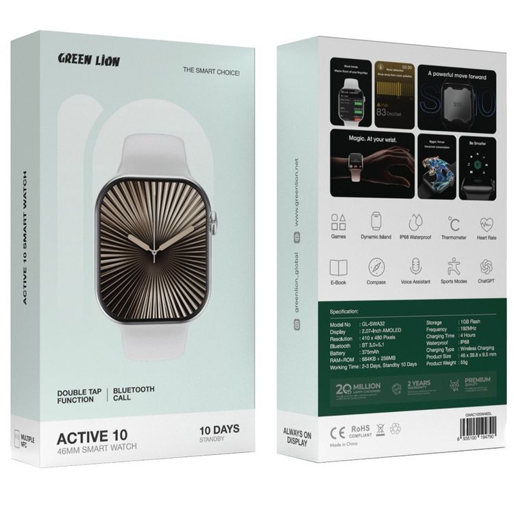 Green Lion Active10 46mm Smart Watch with Voice Assistant, Bluetooth Calling, Double Tap Function, Heart Rate Monitoring, ChatGPT Support, 2-3 Days Working Time & 10 Days Standby Time, 4 Hours Charging Time - Silver