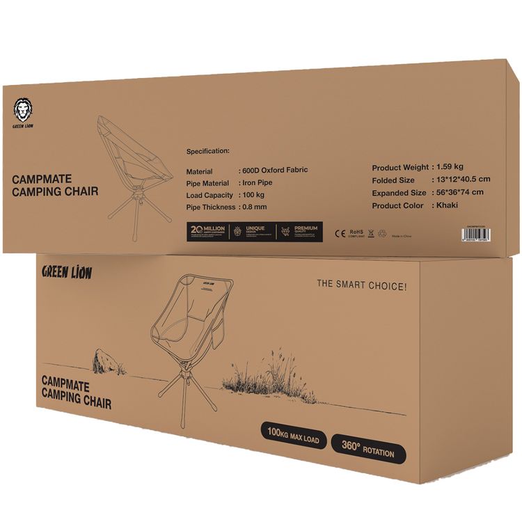 Green Lion CampMate Camping Chair with Storage Pocket, Foldable Design, 100kg Load Capacity, Mesh Backrest, 360° Rotation, 0.8 mm Thick Iron Pipe - Khaki