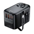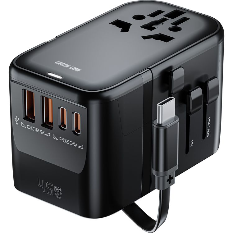 Green Lion Companion 45 Universal Travel Adapter, UK-US-EU-AUS Plug Types, 50cm Retractable USB-C Cable, 45W Power Delivery, 6-Device Charging, PC Flame Retardant - Black
