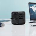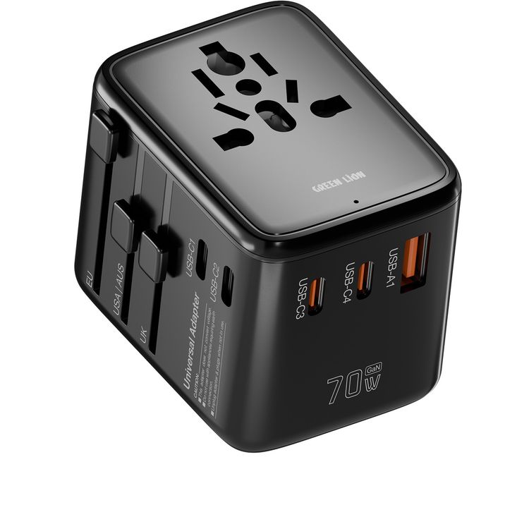Green Lion Companion 70 Universal Travel Adapter, 1000-2400W Power, PC Flame Retardant Material, Slide-Switch Plugs, 6-Device Charging, 70W Power Delivery - Black