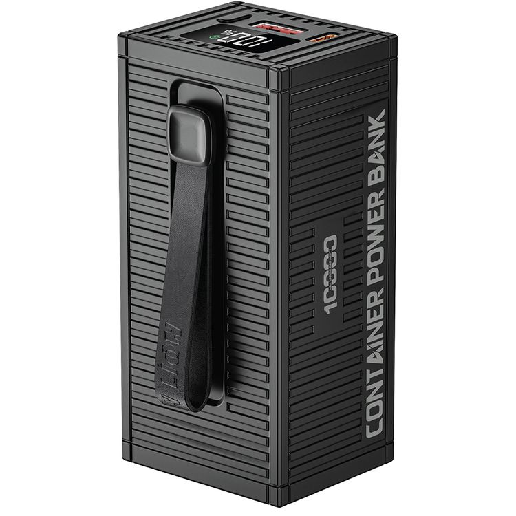 Green Lion Container 10000mAh Power Bank with 4 in 1 Charging Cable, Built-in Flashlight, Digital Display, PD20W Fast Charging, QC3.0 22.5W, Built-in Carry Strap - Black