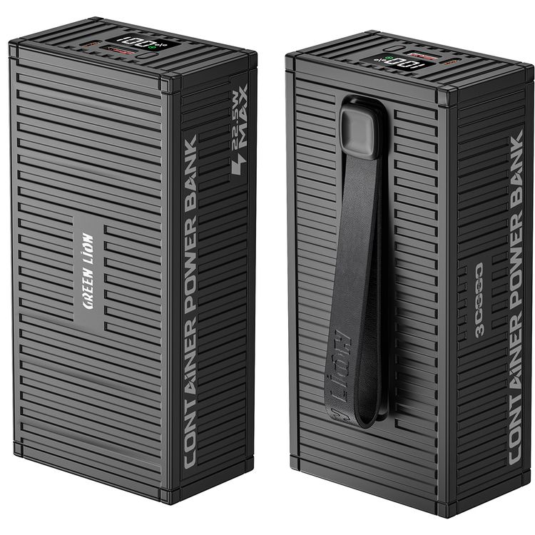 Green Lion Container 30000mAh Power Bank with 4 in 1 Charging Cable, Built-in Flashlight, Digital Display, PD20W Fast Charging, QC3.0 22.5W, Built-in Carry Strap - Black