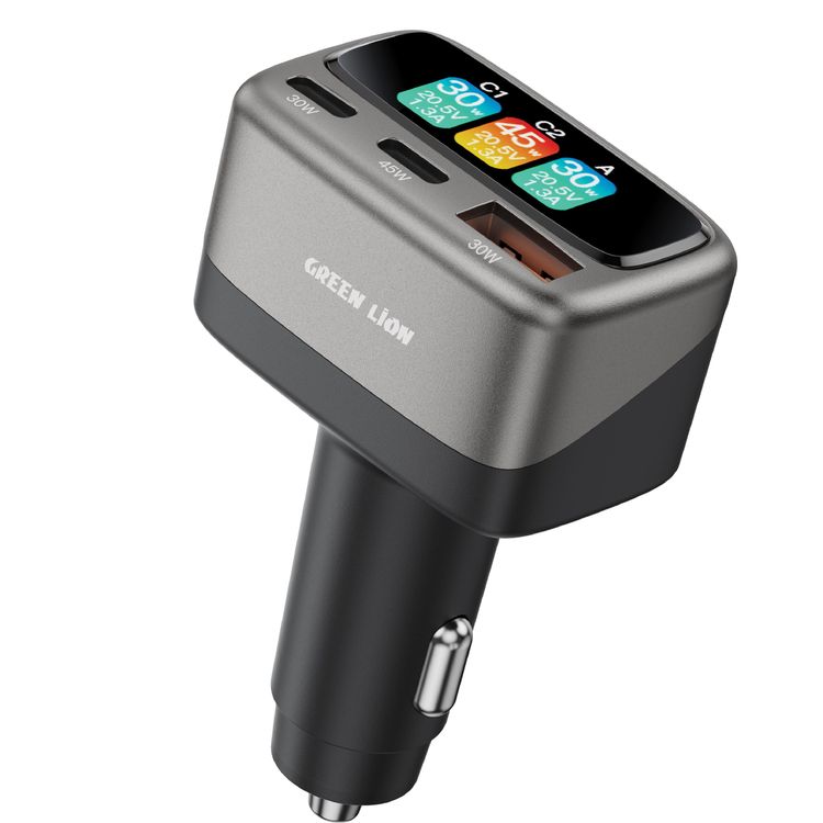 Green Lion Drive Core 105W Car Charger with 3-Ports Fast Charging Adapter, PD 45W Type-C, QC 30W USB-A, Zinc Alloy with TFT Voltage Monitor, for iPhone & Samsung, Light and Thin Laptops & Tablets, Zinc Alloy + Flame Retardant PC Material - Gray