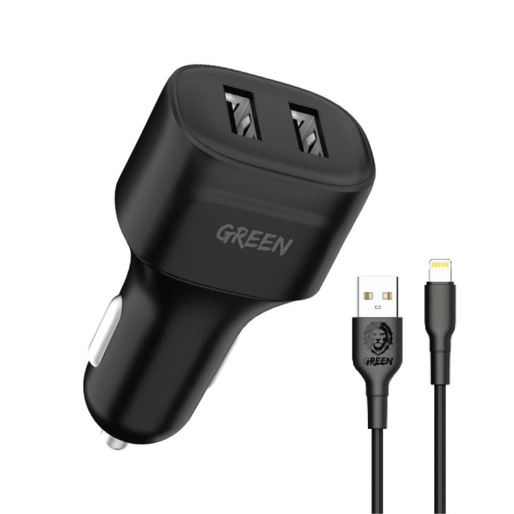Green Lion Dual Port Car Charger 12W with PVC Lightning Cable 1.2M, Fast Charging Ultra-Fast Sync Charge Cable, Over-Current Protection, Compatible for iPhone Lightning Devices