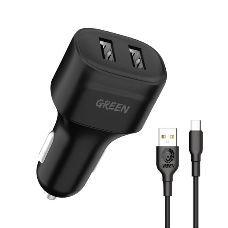 Green Lion Dual Port Car Charger 12W with PVC Type-C Cable 1.2M Fast Charging, Ultra-Fast Sync Charge Cable, - Black