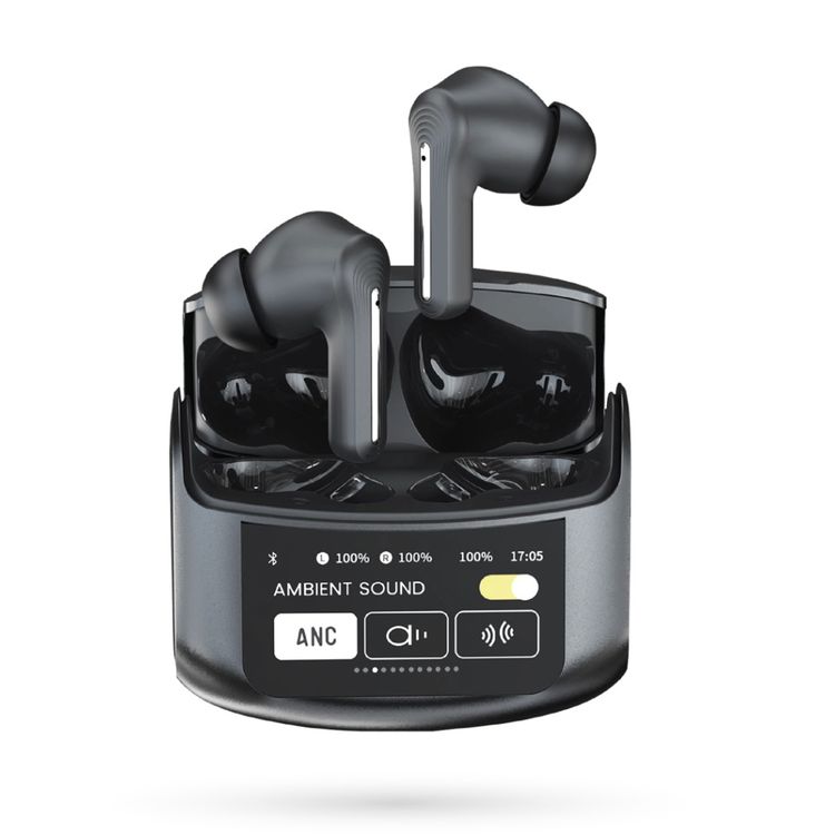Green Lion Elite Wave Earbuds with ANC Technology, 1.47" Touch LCD, 13mm Driver, Up to 5 Hours Play Time, Automatic Link, Sweat-Proof, 40mAh Earbuds & 400mAh Charging Case Battery - Black