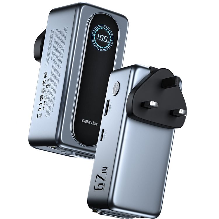 Green Lion Evera 15000mAh Power Bank + Charger with TFT Display, PD 67W, Built-in Type-C Cable, Multi-Device Charging, Flight Approved, USB-A & USB-C Ports, EU/UK/AUS Plugs Included - Gray