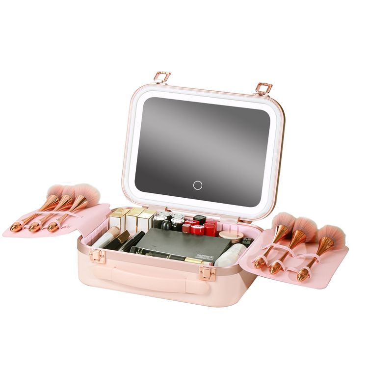 Green Lion Fest Make-Up Bag with Lighted Mirror & Adjustable brightness, 2000mAh Battery, 3-5 Hours Working Time, 72 LED Beads, Cool, Natural & Warm Light Modes, Adjustable Storage Partition, High-Definition Mirror, Touch Control Switch, Water-Resistant, Carry Handle - Pink