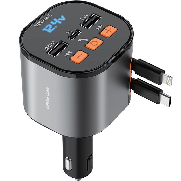 Green Lion FM Retractable Car Charger with Type-C & USB-A Ports, ABS & PC Material, Built-in 80cm Cables, Safety Fuse, Overcurrent & Short-Circuit Protection, Digital Display, Button Controls, 180° Adjustable Angle - Black