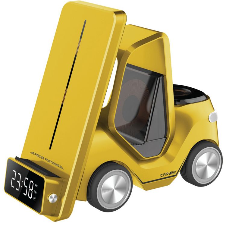 Green Lion Forklift 5-in-1 Wireless Charger with Night Light Function, 15W Phone Output, Fast Charging, Digital Clock Display, 2.5W Watch Output, 5W AirPods Output - Yellow