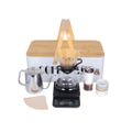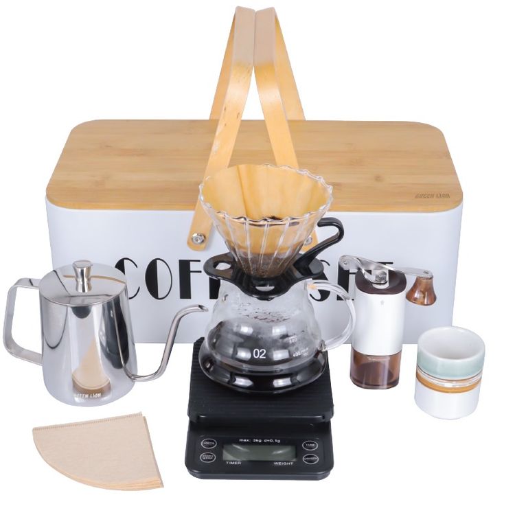 The Green Lion G-70 8-in-1 Coffee Maker Set distinguishes itself with a range of special features that elevate the coffee-making experience. Encased in an aesthetically pleasing metal box with a sturdy wood handle, this set exudes a sense of sophistication. The inclusion of an acrylic hand grinder stands out as a unique feature, enabling users to freshly grind their coffee beans on the spot, enhancing the richness and aroma of each brew. The set's meticulous design extends to the glass dripper and the 40 accompanying paper filters, ensuring a clean and flavorful pour-over. Additionally, the inclusion of a scale allows for precise measurement, ensuring the perfect brew ratio. The ceramic server and refined black cup add a touch of elegance to the presentation, making the Green Lion G-70 a comprehensive and stylish coffee ritual in a box. These distinctive features set it apart from other coffee makers in the market, offering a complete and customizable coffee experience for enthusiasts who seek both quality and aesthetics.