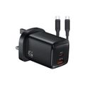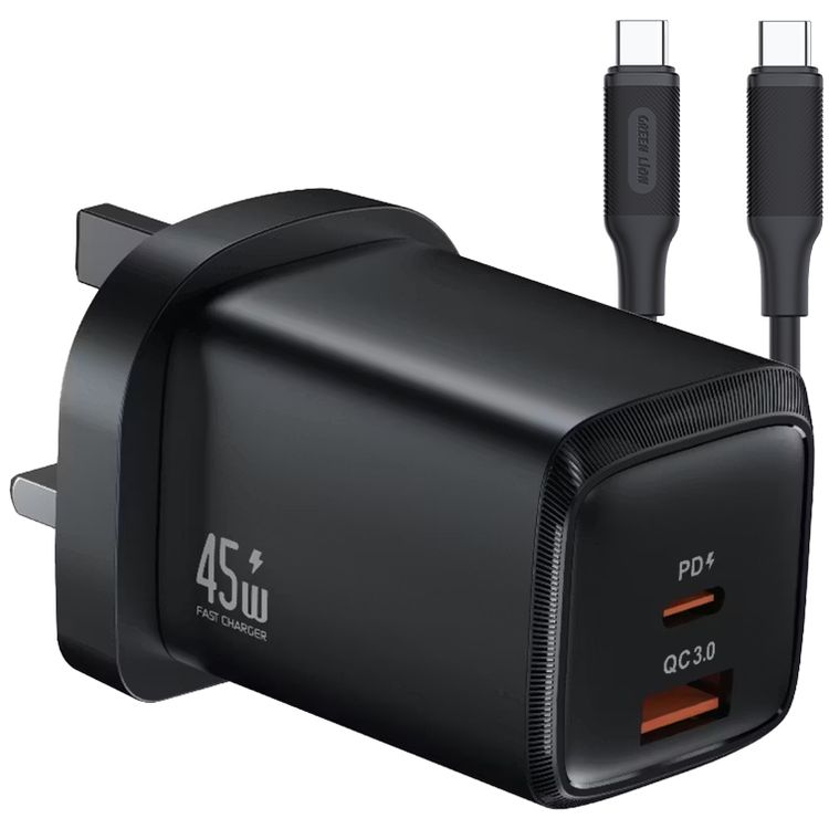 Green Lion G-Charge Series Wall Charger with Type-C to Type-C Cable, PD 45W, QC 18W, USB-A & USB-C Ports, 3-Pin UK Plug, ABS & Copper Material, Fast Charge Support, GaN Technology - Black