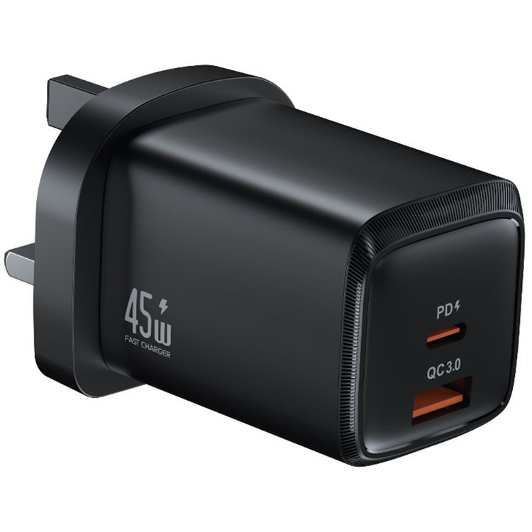 Green Lion G-Charge Series Wall Charger with PD 45W, QC 18W, USB-A & USB-C Ports, 3-Pin UK Plug, ABS & Copper Material, Fast Charge Support, GaN Technology - Black