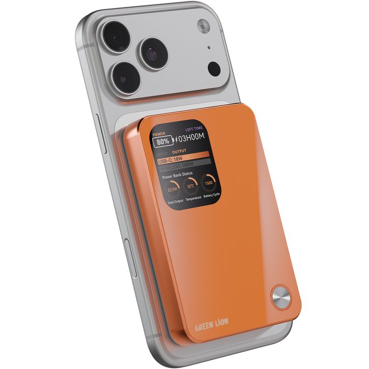 Green Lion G-Mag 3-in-1 Power Bank with 10000mAh Capacity, MagSafe Compatibility, PD 20W Fast Charge, Aluminum Alloy Shell, USB-C Input & Output Port, Ultra-Slim Design, Built-in Safeguards, Real-Time Power Display, Durable Aluminum Alloy + ABS + PC Material - Orange