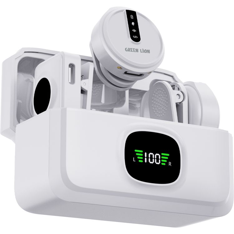 Green Lion GLM-Wireless Mic Lite with 7 Hours Working Time, Compatible with Type-C & Lightning & AUX Devices, 360° Pick Up, Type-C Charging Port, Ultra-Low Latency, ENC Noise Cancellation, 2× Microphones and 1× Receiver, 20m Working Distance, Digital Transmission - White