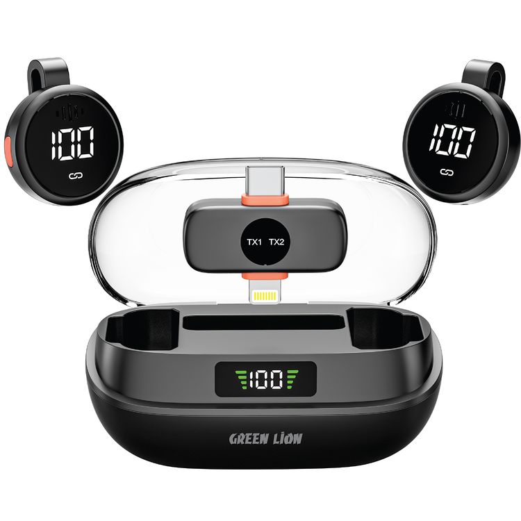 Green Lion GM-91X Lavalier Microphone with 15 Hours Play Time, Digital Display, Noise Reduction, Compatible with USB-C & Lightning Devices, Reverb Mode, Auto Pairing, Ultra-Low Latency, 20m Wireless Freedom, USB-C Charging Port, 360° Omnidirectional, Magnetic Clip-On - Black