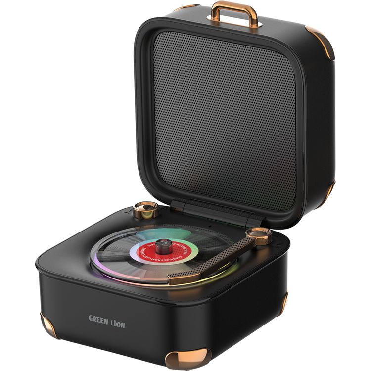 Green Lion Gramo Vinyl Wireless Speaker with 7-Color Ambient Light, Rotating Vinyl Disc, TF Card Playback, Dual-Speaker Wireless Sync, Hands-Free Call, HiFi Sound Quality, Suitcase-Style Foldable Design, Classic Knob Volume Control, Fast & Stable Wireless Connection, Multi-Playback Mode - Black