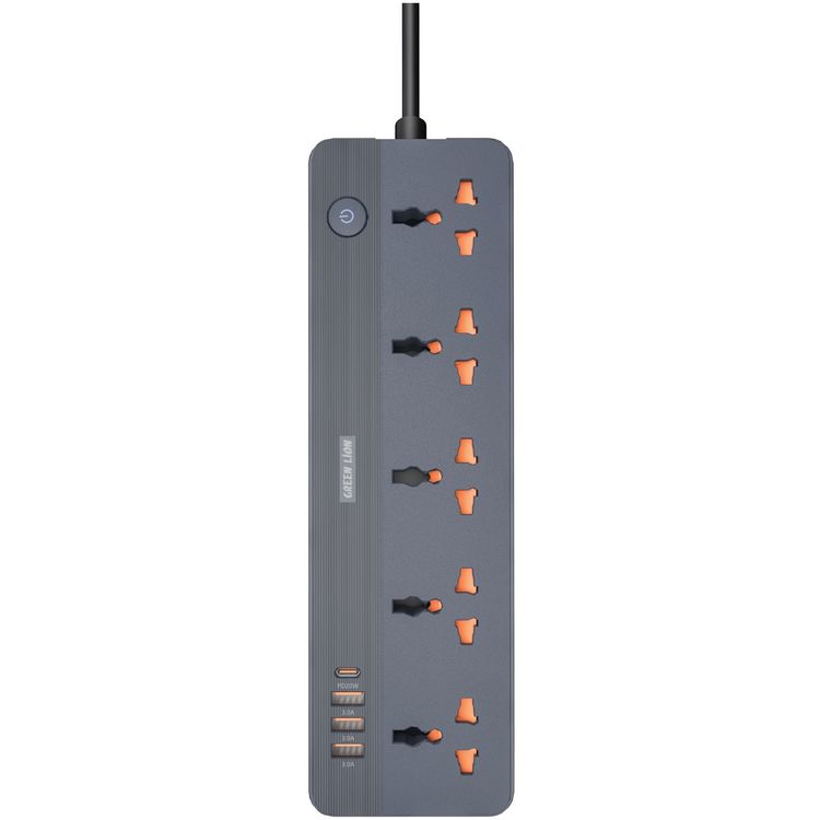 Green Lion GS-250 Power Socket with 20W Power Delivery, 250V Voltage, 10A Rated Current, Lightning Protection, 5 Universal Sockets, 3 USB-A Ports, 2500W Rated Power - Black
