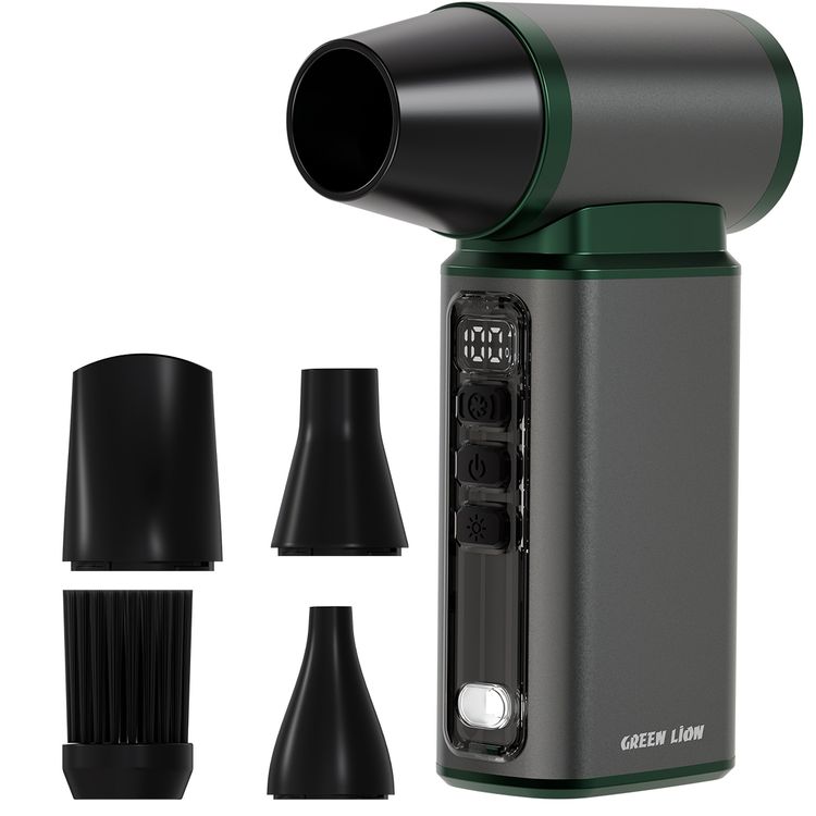 Green Lion Jet Max Air Blower with 110000 RPM, 45m/s Wind Speed, 5-Speed Adjustment, Turbo Boost Mode, 240 Minutes Runtime, Digital Display, LED Spotlight, USB-C Charging Port, Interchangeable Nozzles, Brushless Motor, 2-3 Hours Charging Time - Gray