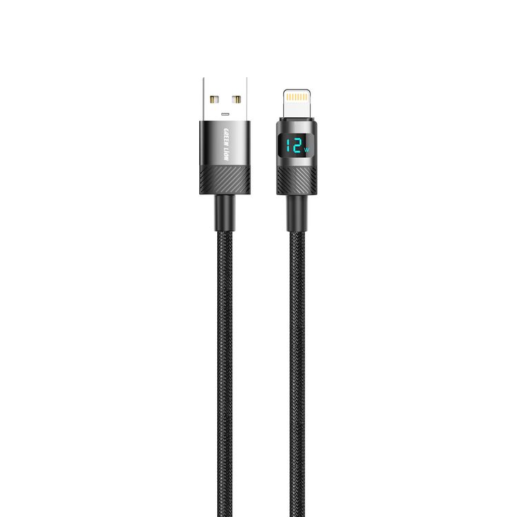 Green Lion LED Display Braided 1m USB-A to Lightning Cable, 30W Charging, Charge & Sync, Secure & Safe, 480Mbps Data Transfer Speed - Black