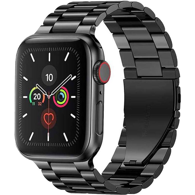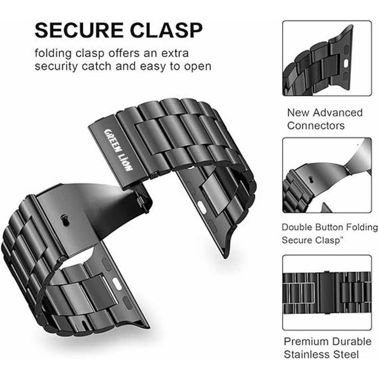 Green Lion Link Stainless Steel Strap for Apple Watch 42/44/45/49mm, Double Button Folding Clasp, Lightweight & Easy to Install, Comfortable to Wear, Waterproof - Black