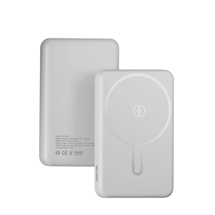 Green Lion Malaga 5000mAh Power Bank with Strong Magnetic Hold, Flight Approved, Built-in Safeguards, Type-C Input/Output, MagSafe Compatibility, QC 3.0 22.5W, PD 20W Fast Charging, 15W Max Wireless Output - White