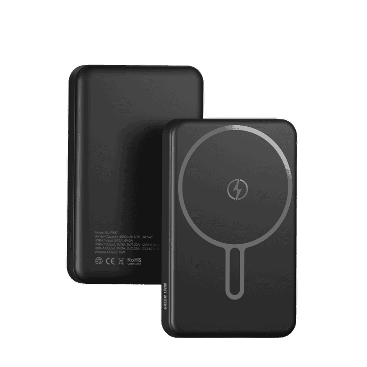 Green Lion Malaga 5000mAh Power Bank with Strong Magnetic Hold, Flight Approved, Built-in Safeguards, Type-C Input/Output, MagSafe Compatibility, QC 3.0 22.5W, PD 20W Fast Charging, 15W Max Wireless Output - Black