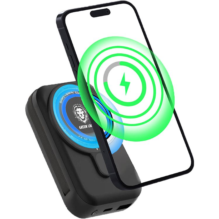 Green Lion Monaco MagSafe 10000mAh Power Bank with Built-in Lightning Cable, Wireless Charging Compatibility, 22.5W PD & QC Output, 15W Wireless Output, LCD Display - Black