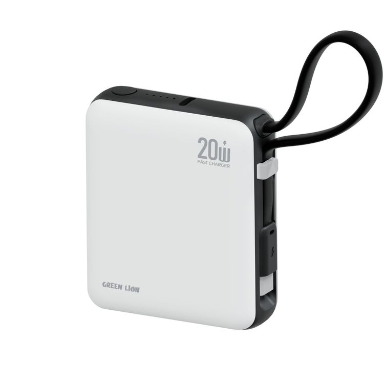 Green Lion Nuru 10000mAh Power Bank with PD 20W Fast Charging, Safety Protections, Slim Compact Design, Flight Approved, 2-in-1 Cable & Lanyard Included - White