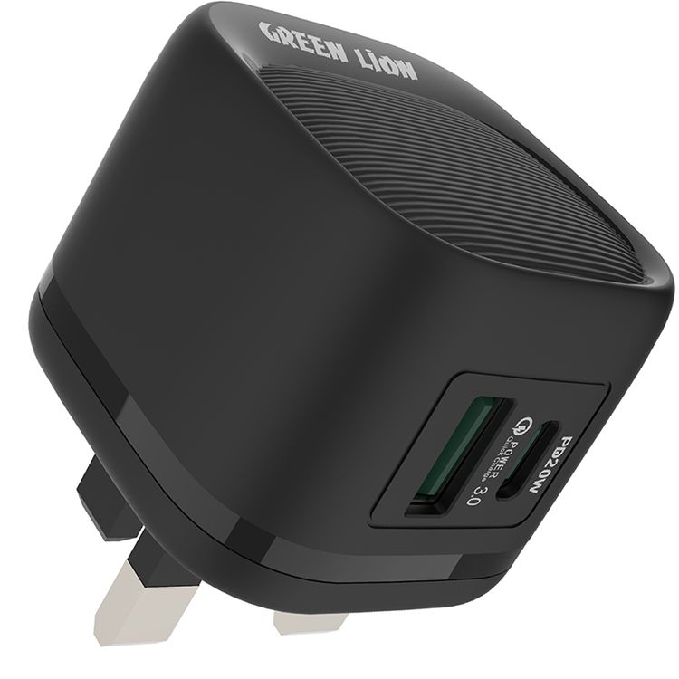 Green Lion PD 20W UK Wall Charger with Charging Protection, 5V/3A (15W) USB-A & USB-C Output Shared Output, Fast Charging - Black