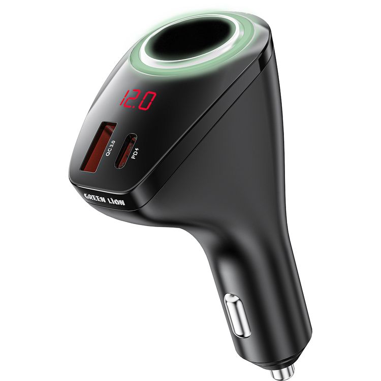 Green Lion Power Drive Car Charger with PD 45W, QC 30W, 12V Socket Splitter, USB-A & USB-C Ports, Heat Dissipation, Car Voltage Display - Black