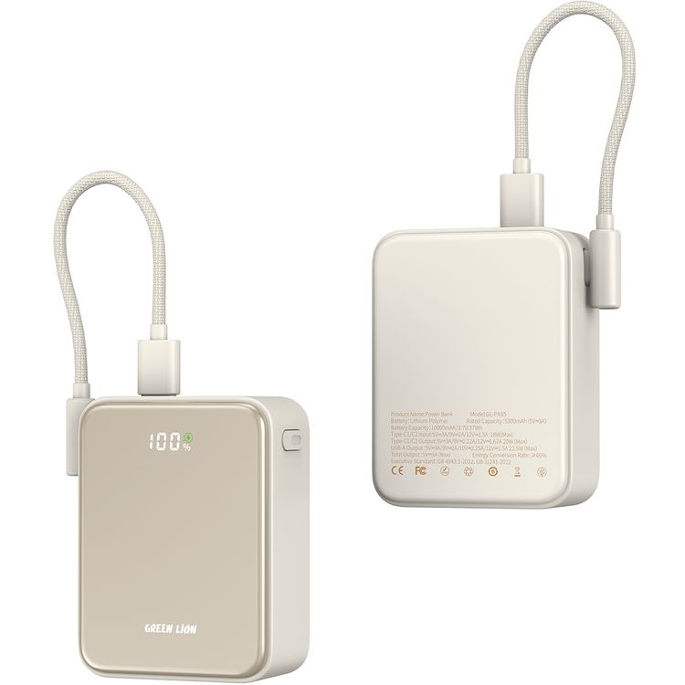 Green Lion Salzburg 10000mAh Power Bank with USB-C Lanyard Cable, Flight Approved, Real-Time Power Display, Pass-Through Charging, QC 3.0 22.5W, PD 20W Fast Charging - White