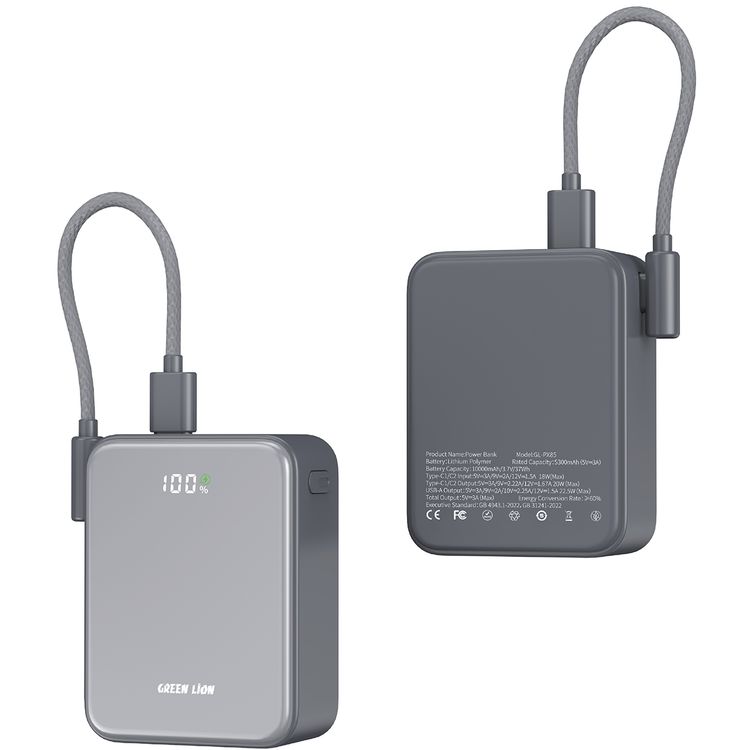 Green Lion Salzburg 10000mAh Power Bank with USB-C Lanyard Cable, Flight Approved, Real-Time Power Display, Pass-Through Charging, QC 3.0 22.5W, PD 20W Fast Charging - Gray