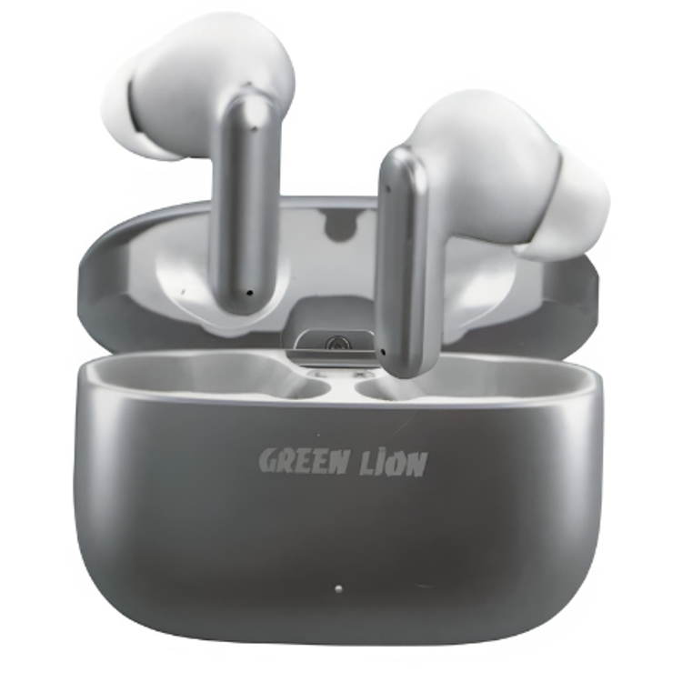 Green Lion Santorini Stereo Earphones, 5 Hours Playtime, High-End Metal Material (Zinc Alloy), 30 mAh Each Earbud Battery Capacity, Up to 180 Hours Standby Time, 300 mAh Charging Case Capacity, MFB Touch, Bluetooth Version 5.3 - Silver