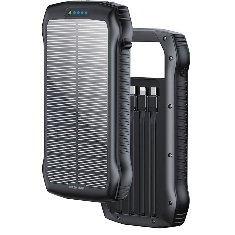 Green Lion Solar Force 20000mAh Power Bank with PD20W USB-C Output, ABS + PC + Silicone Material, 4-Mode Flashlight, 4 Built-in Cables - Black