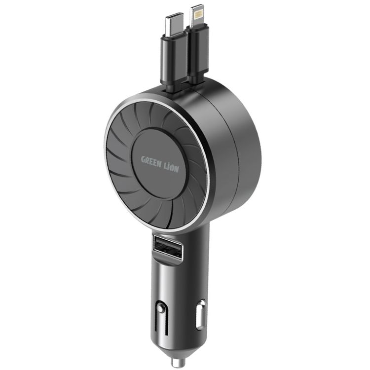 Green Lion Telescopic 50W Car Charger with Built-in Fuse, Telescopic Charging Cable, Overcurrent and Short Circuit Protection, Charge Three Devices at the Same Time - Black