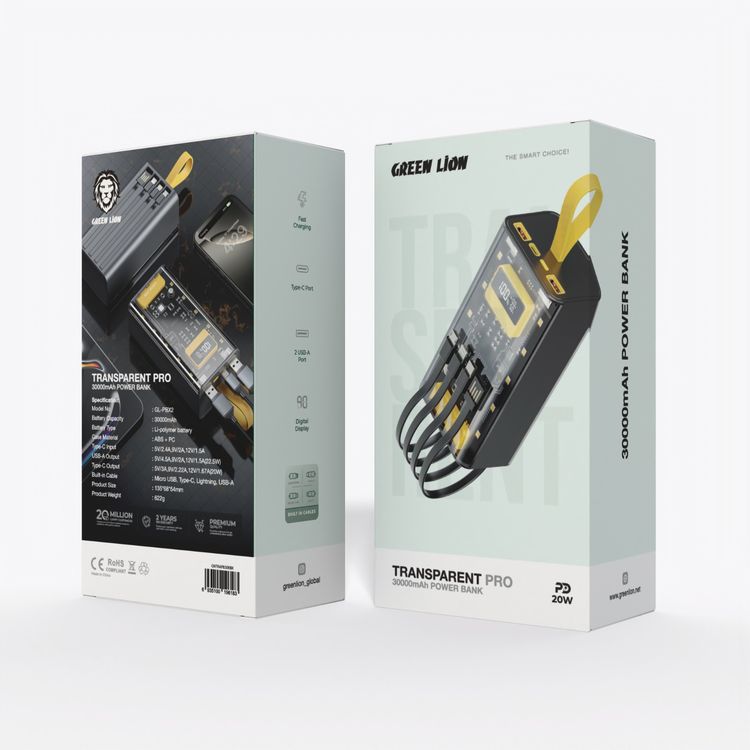 Green Lion Transparent Pro Power Bank 30000 mAh, PD 20W, Fast Charging, Micro & Type-C & Lightning & USB- A Built-in Cables, Digital Display - Black / Yellow