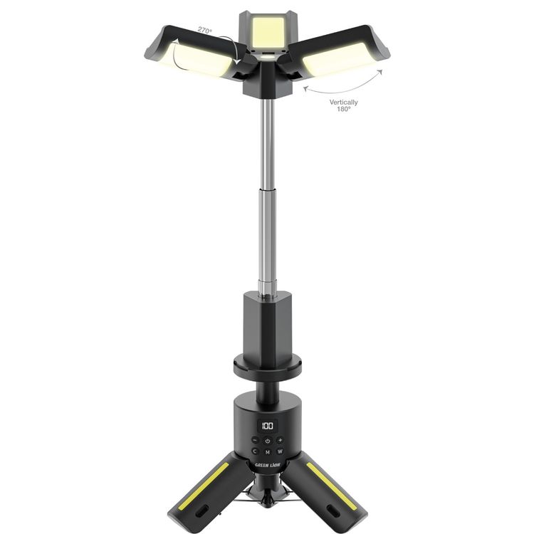 Green Lion Trio Beam Tripod Camping Light with Digital Display, Up to 80 Hours Working Time, White, Golden, 7-Color RGB Light Modes, 5-Level Brightness, Memory Function, Reflective Strips - Black