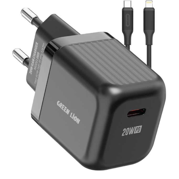 Green Lion Ultra Compact GaN Wall Charger with Single USB-C Port and USB-C to Lightning Cable, PC Flame Retardant Material, Fast Charging Support, Charging Protection, Universal Compatibility, Ultra Portable - Black