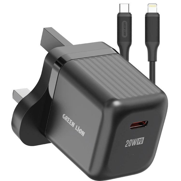 Green Lion Ultra Compact GaN Wall Charger with Single USB-C Port and USB-C to Lightning Cable, PC Flame Retardant Material, Fast Charging Support, Charging Protection, Universal Compatibility, Ultra Portable - Black